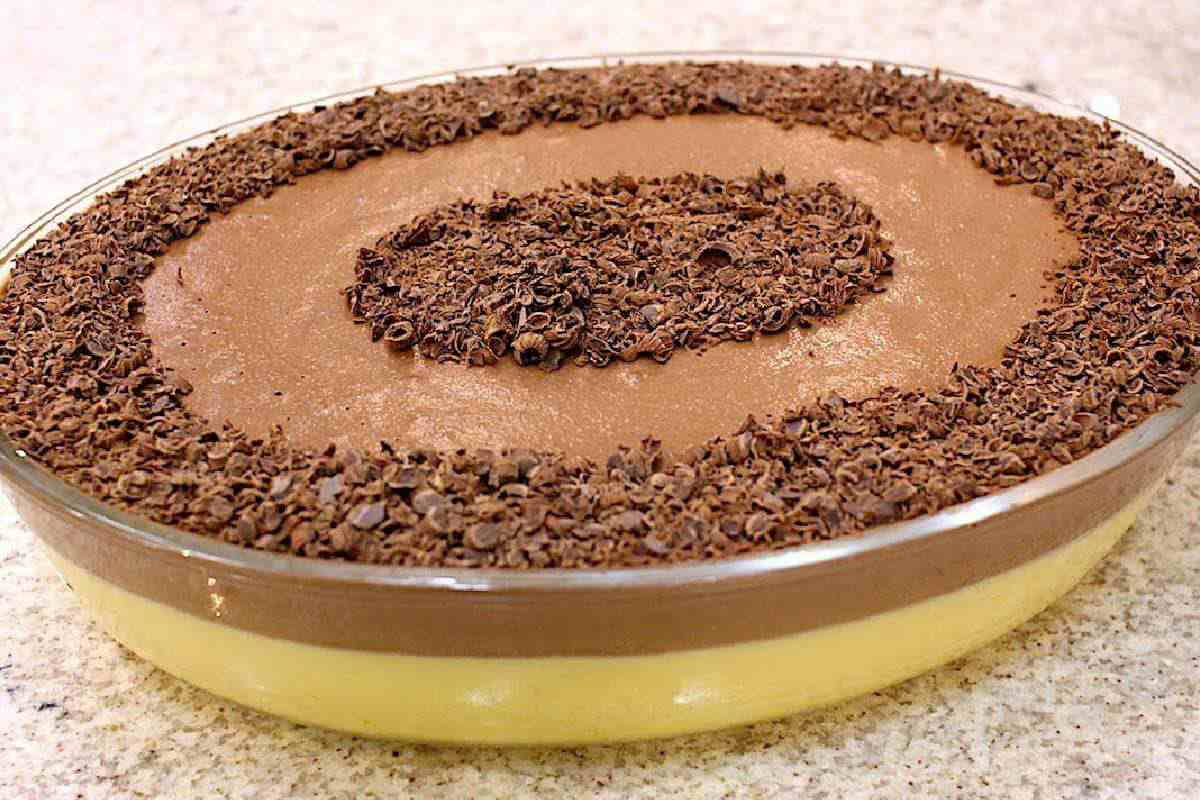 7. Despeje a mousse de chocolate sobre a de maracujá e deixe gelar por mais 5 horas ou durante a noite.